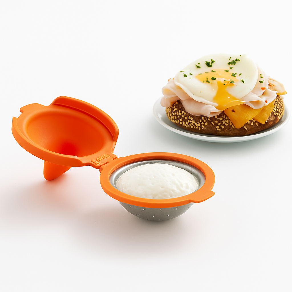 Prepara huevos escalfados perfectos en solo 3 minutos con el Egg Poacher. Su diseño flotante con acero inoxidable y silicona platino permite una cocción rápida, segura y sin complicaciones. Ideal para desayunos y brunch.