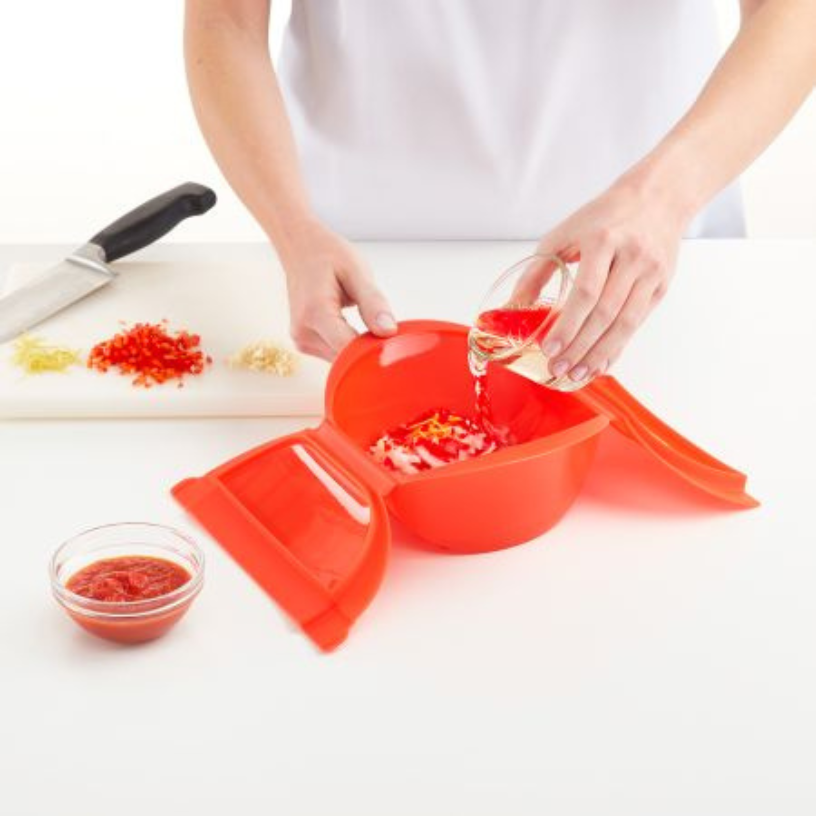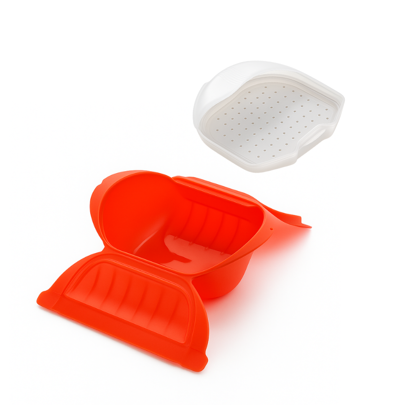 Cocina al vapor de forma rápida, saludable y práctica. Este estuche está fabricado 100 % en silicona platino, un material seguro, libre de BPA y apto para microondas. Su diseño versátil permite preparar porciones generosas de verduras, pescado o incluso sopas, en tan solo unos minutos.