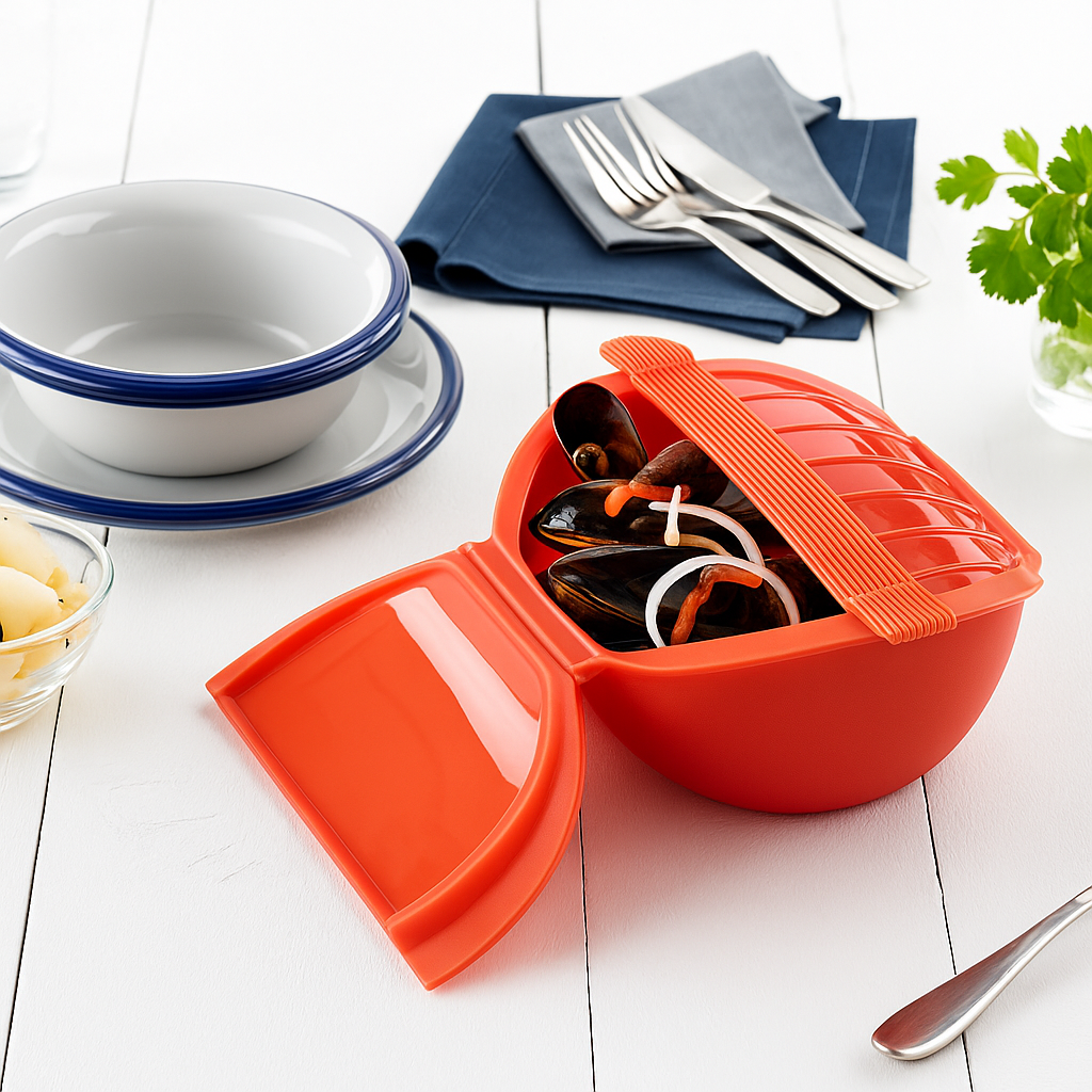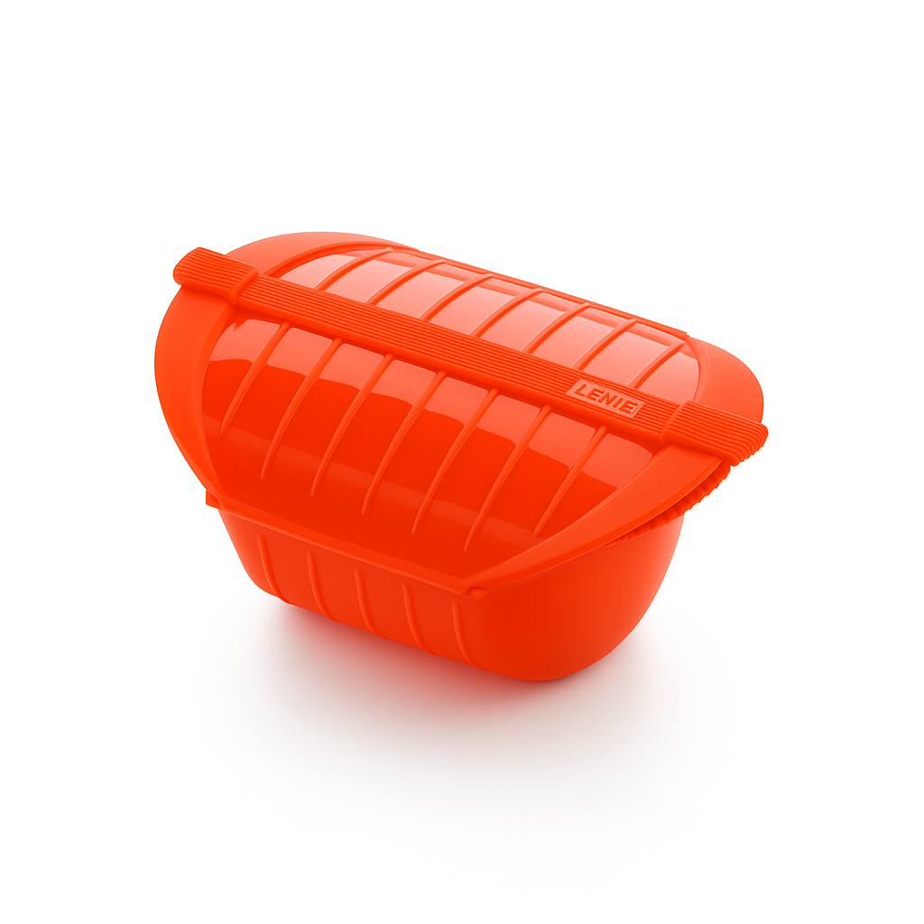 Estuche para cocinar al vapor en microondas, fabricado 100 % en silicona platino. Su diseño profundo permite preparar porciones grandes o sopas en minutos. Incluye bandeja para cocción dual o para añadir aromas a tus recetas.
