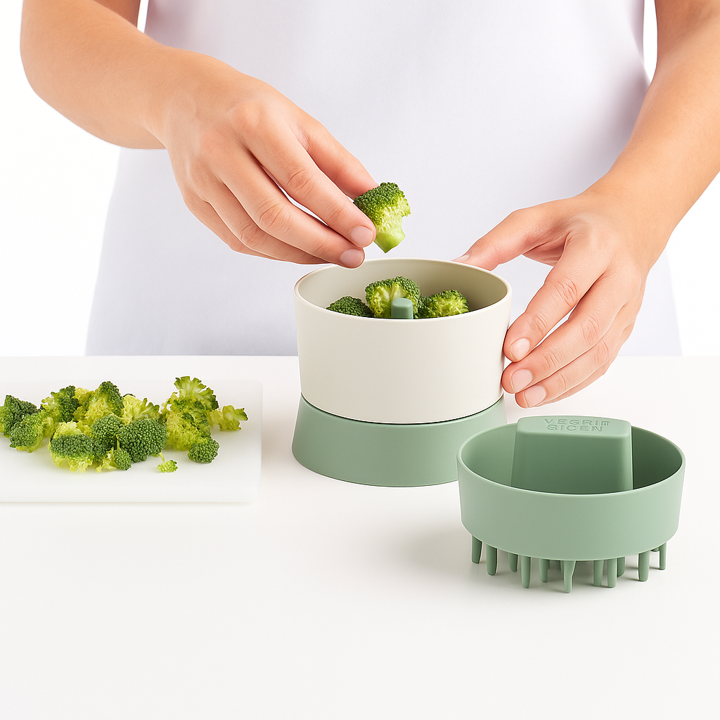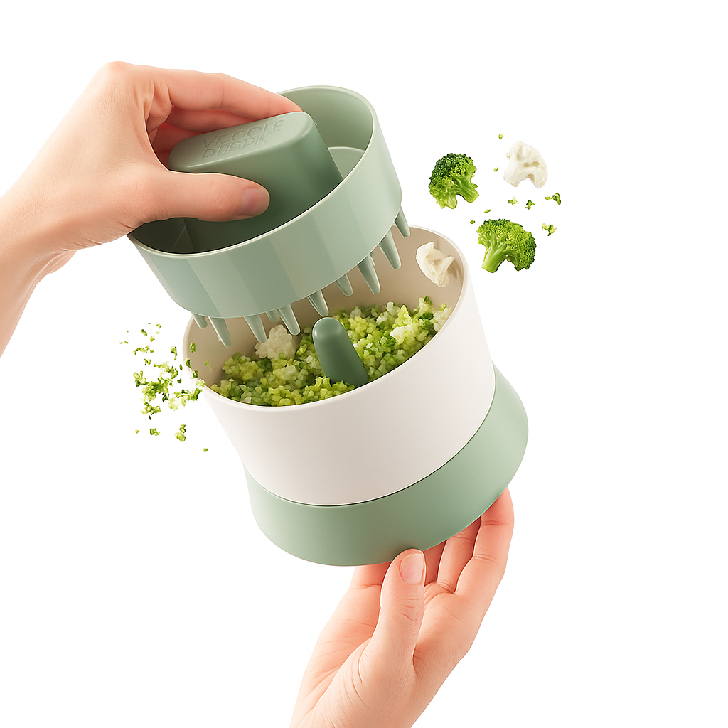 Con el Veggie Ricer puedes convertir fácilmente coliflor o brócoli en un "arroz" vegetal ligero y nutritivo. Solo corta los vegetales en trozos, gira el recipiente y obtendrás una base perfecta para salteados, bowls o guarniciones.